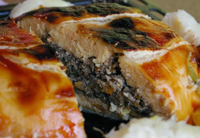 No dia seguinte, tire tudo da geladeira. Coloque a bolota de grão-de-bico numa assadeira, sem o papel alumínio e, com cuidado, abra uma tampa no topo dela com uma colher (pequena). Com a colher ainda, vá retirando, pelo buraco que fez, o recheio da bolota. É como fazemos com as morangas para recheá-las. Quando estiver bem cavado, encha com o recheio de cogumelos. Recoloque a tampa. Não há problemas se rachar um pouquinho. Vamos passar massa folhada ao redor de tudo, então, não vai aparecer. Corte um pedaço da massa folhada e abra bem fina. Coloque sobre a bolota, com a parte central cobrindo a tampa por onde se escavou. Vire e feche a massa folhada. Vire novamente e deixe a parte lisa para cima. Com uma colher, faça riscos paralelos na massa (sem cortar, apenas desenhos). Passe catchup por cima da massa e leve ao forno até dourar. Você pode decorar com frutas, com batatas assadas ou outro legume assado que quiser.
